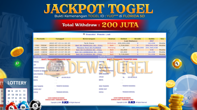 DEWATOGEL JACKPOT TOGEL DI FLORIDA 5D POOLS Rp 200.000.000,- LUNAS